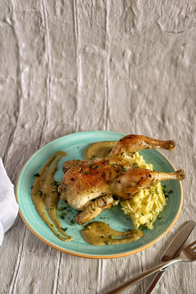 - Mientras se cocinan los picantones preparamos el puré cociendo las patatas y machándolas junto con la nuez moscada, la mantequilla, un poco de perejil, sal y pimienta al gusto. Reservamos.