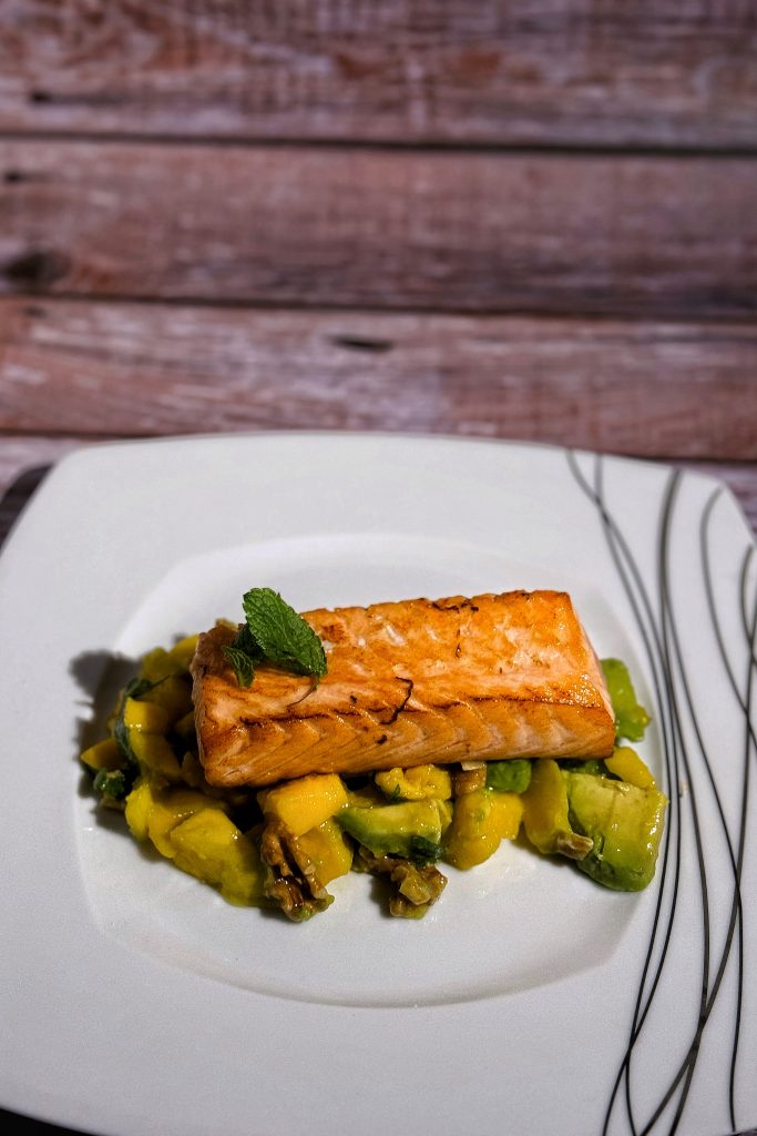 - Montamos el plato con una capa generosa de la mezcla del aguacate y el mango poniendo el salmón encima recién sacado del fuego. Decoramos con unas hojas de hierbabuena.